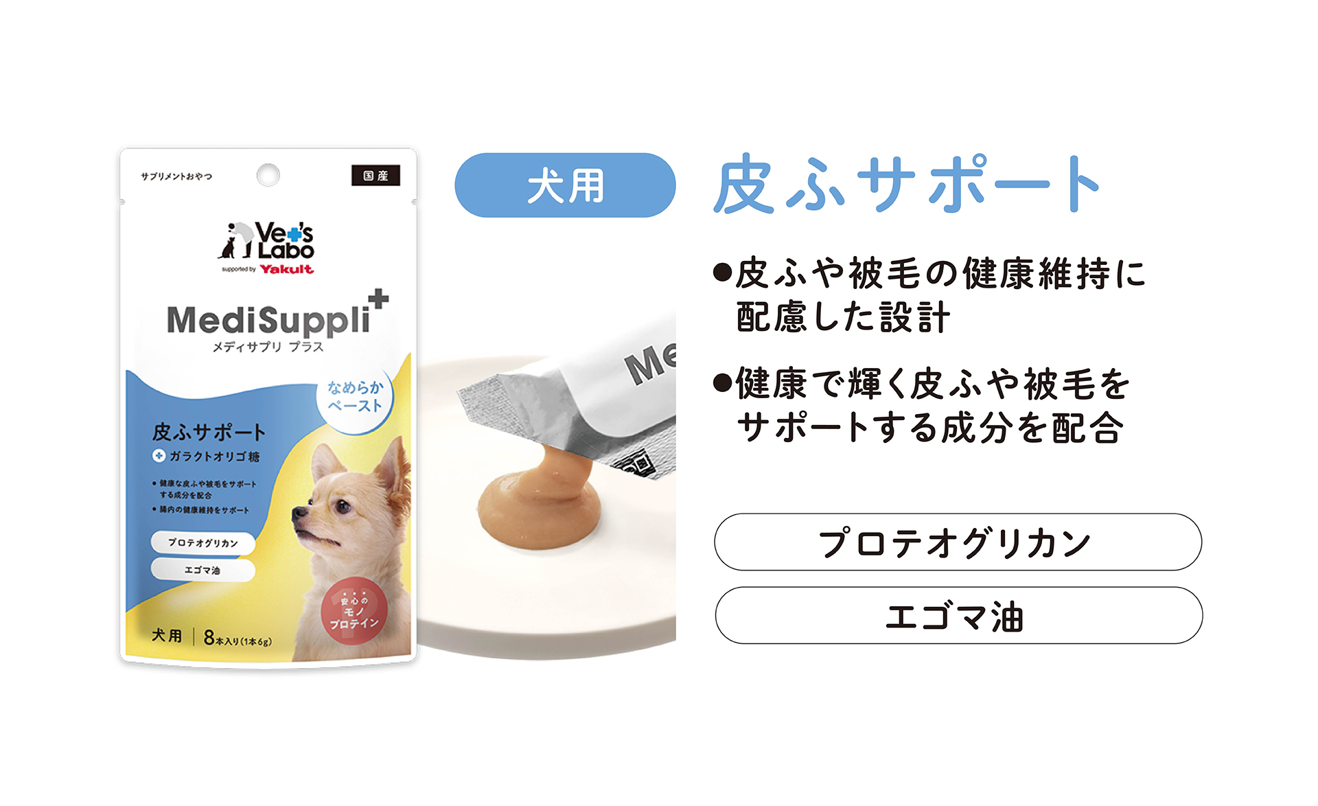 皮ふの健康維持を支えるプロテオグリカンを配合。乾燥しやすい季節や、皮ふが気になりやすい子の“いつものケア”として取り入れやすいタイプです。おすすめはブラッシング後のごほうび。