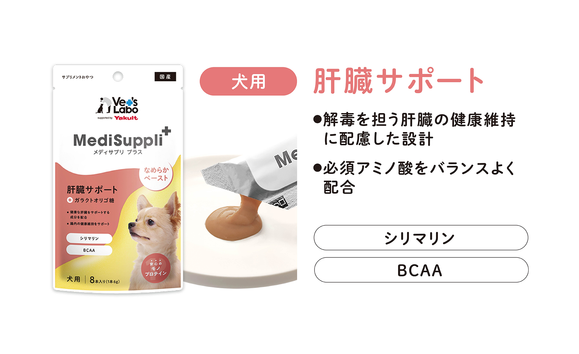 解毒を担う肝臓の健康維持を支えるシリマリン(マリアアザミ)+BCAAを配合。健康診断の数値が気になる子やシニア期の“備え”として、日々のサポートに組み込みやすい1本です。おすすめは夕ごはん前後。