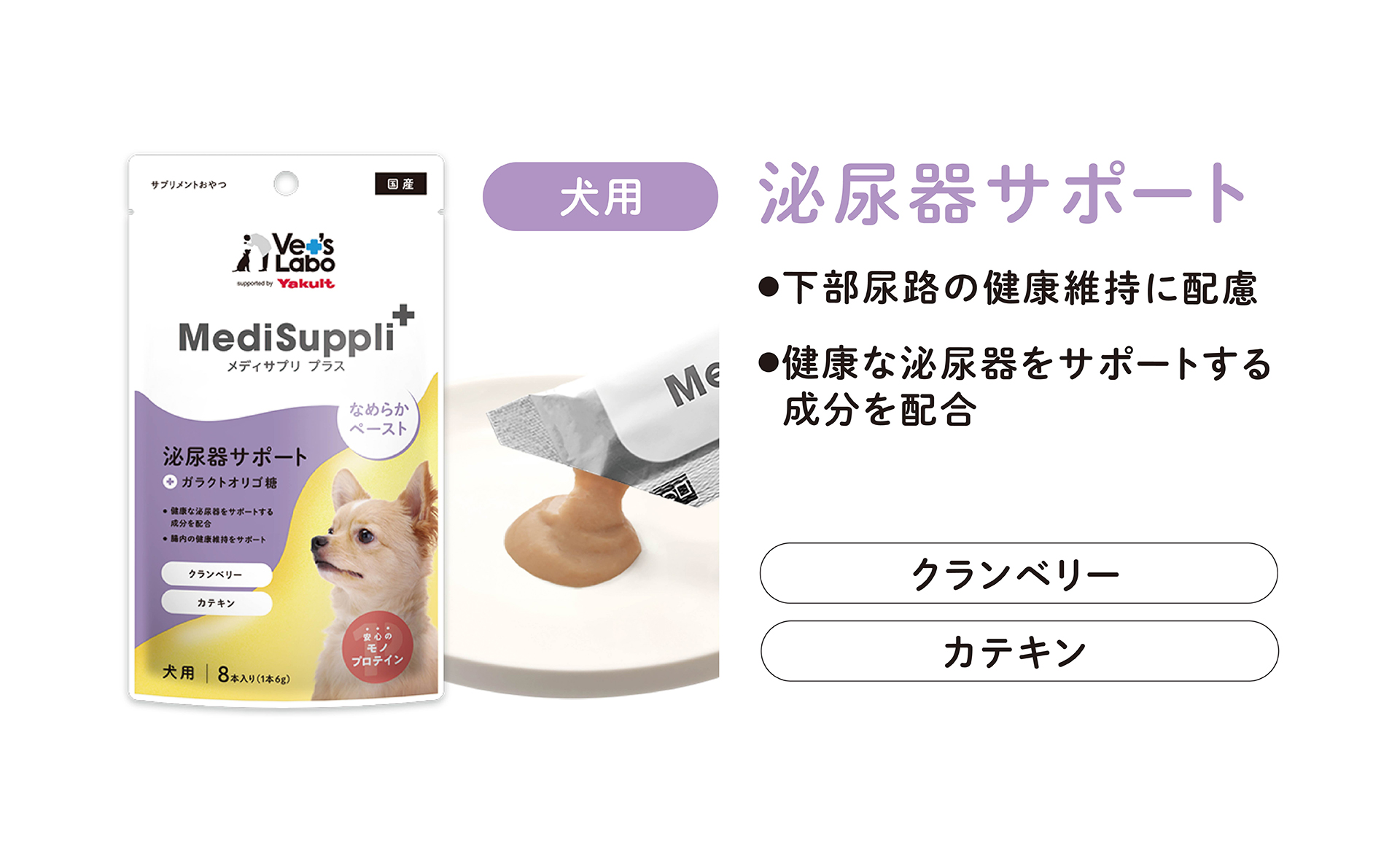 泌尿器の健康維持を支えるクランベリー、メチオニン、カテキン(緑茶エキス)を配合。季節の変わり目などで“おしっこ周り”が気になりやすい子の日常ケアに取り入れやすいタイプです。おすすめはお散歩後。