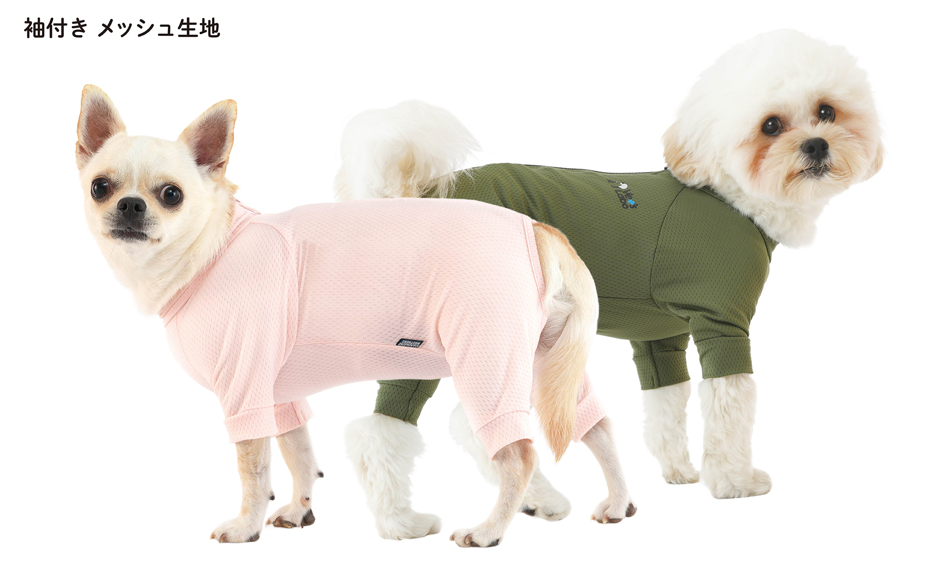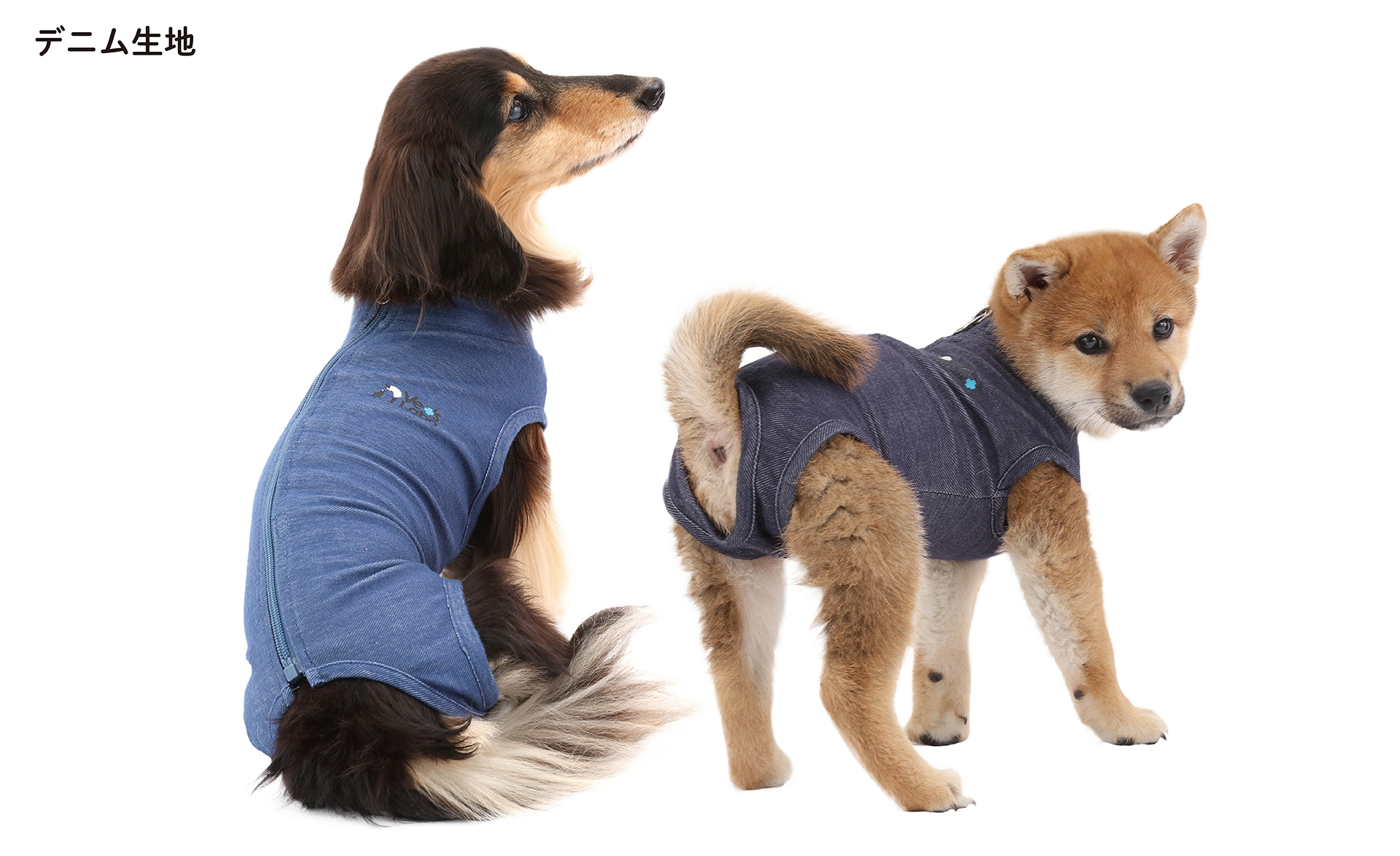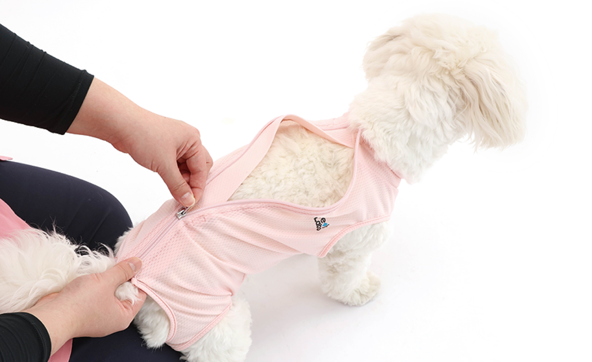 体調が優れない時や、デリケートな皮膚に触れる際は、着脱時のストレスを減らすことが重要です。背中全面が大きく開くファスナー仕様で、頭から無理に被せる必要がなく、飼い主様もペットもスムーズに着用できます。もちろん、着用したまま排泄も可能です。