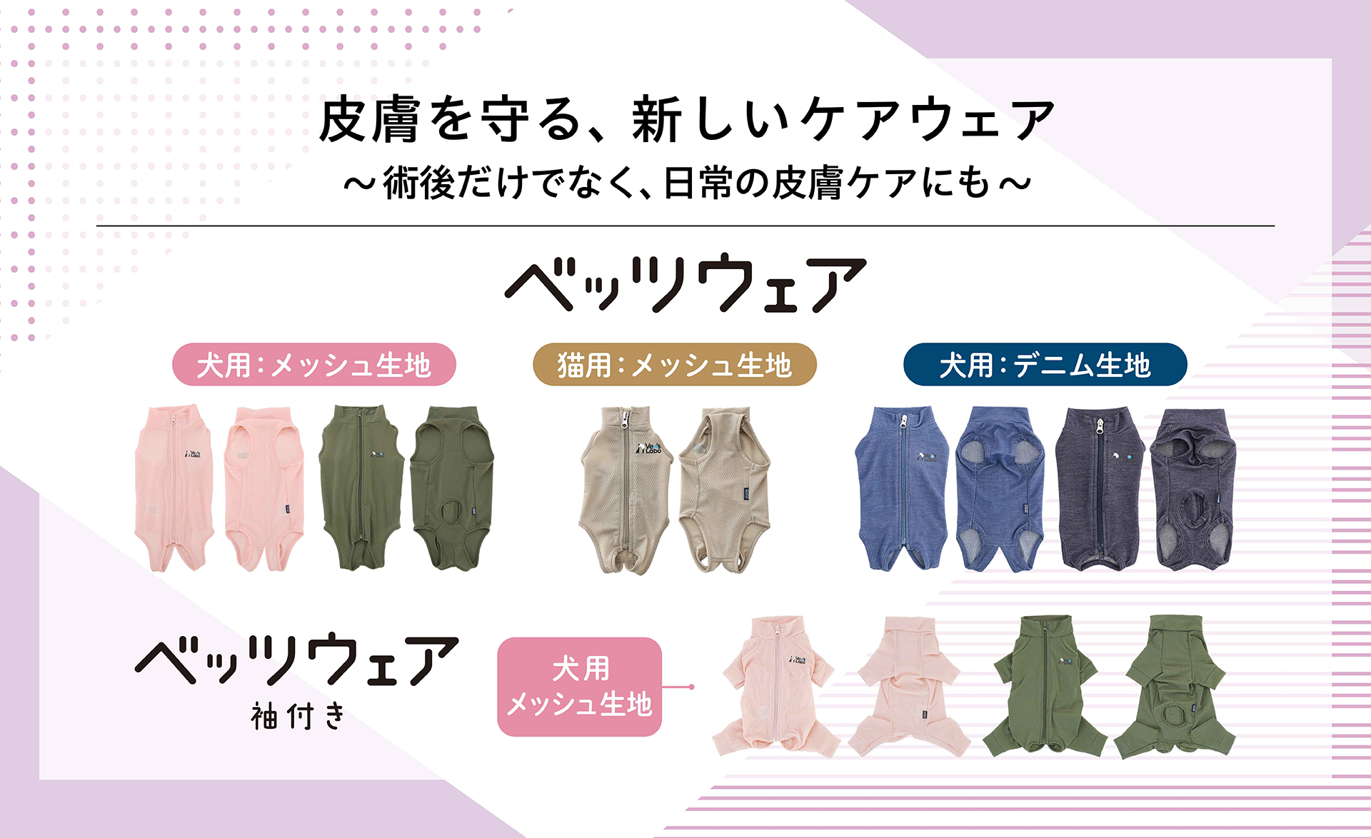 Vet's Wearは、体にやさしくフィットする設計で皮膚をカバーし、舐め壊しや掻き壊しによる皮膚ダメージを軽減することを目的としたウェアです。