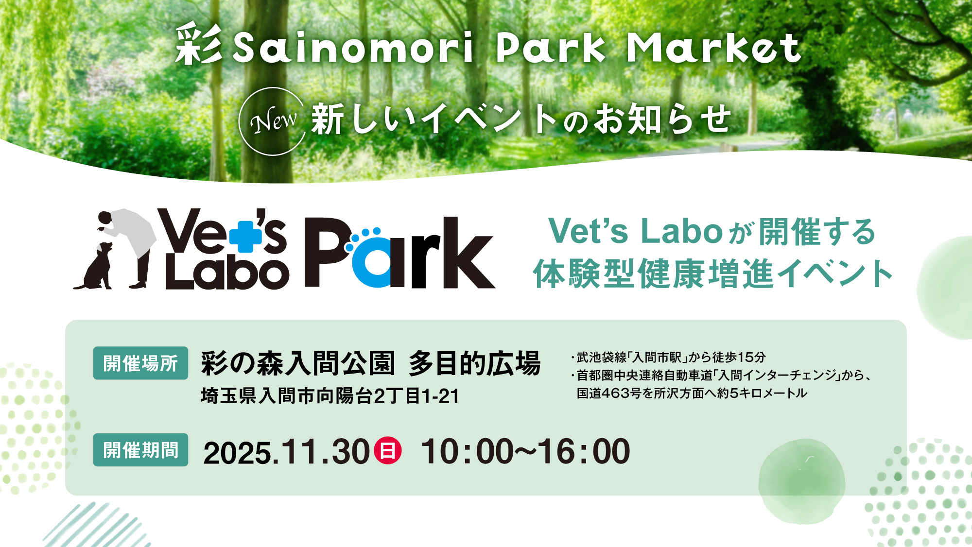2025.11.24 11月24日 彩Sainomori Park Market 『彩Sainomori Park Market』に出店いたします。 場所は、彩の森入間公園 多目的広場です。 Vet's Labo Parkでは、イベント価格での販売・試食のご用意、獣医師による体脂肪測定会、クイズやゲームとコンテンツが盛りだくさんです。 皆様ぜひお立ち寄りくださいませ。 一覧に戻る